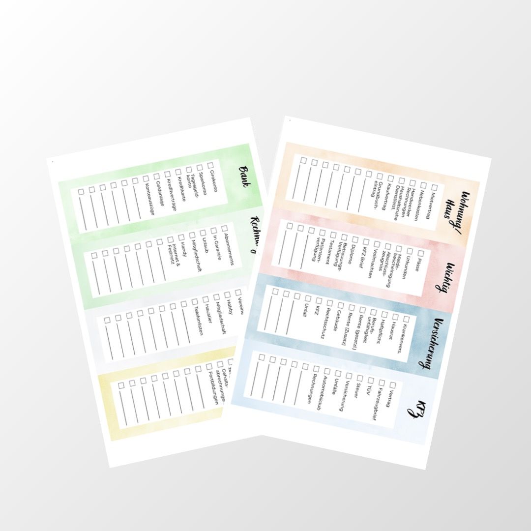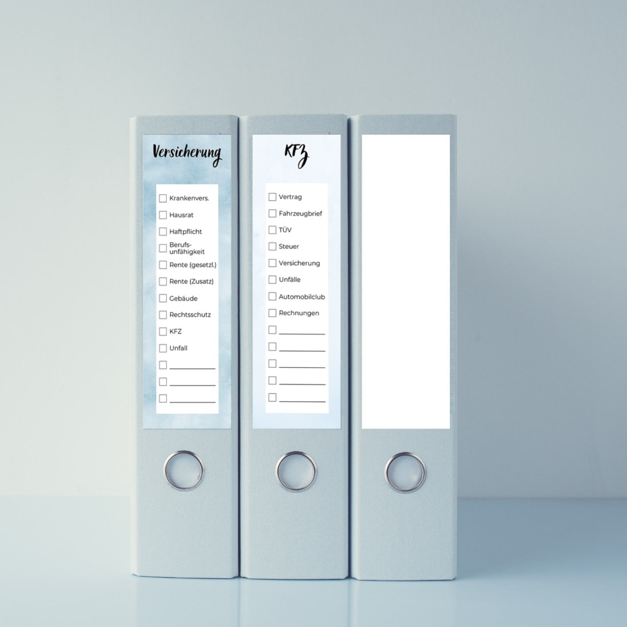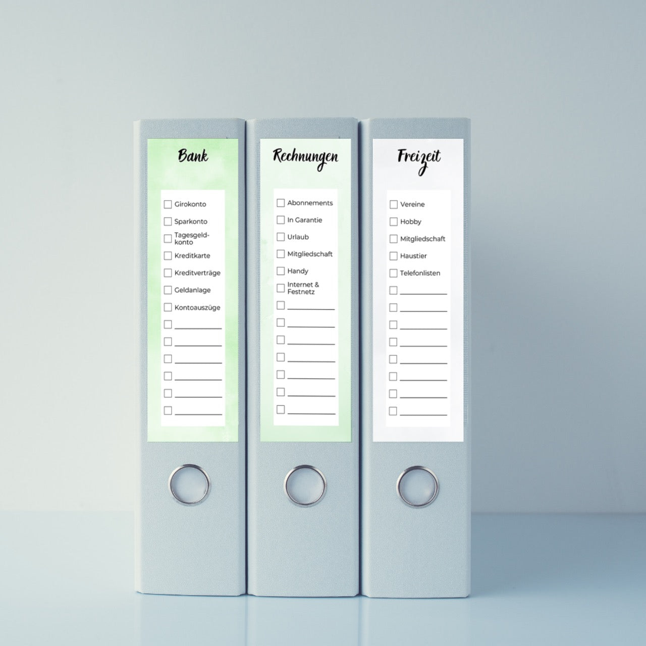 Mit den vorbeschrifteten Etiketten brauchst du den Inhalt nicht auf deine Ordner schreiben, sondern kannst einfach einen Haken in das Kästchen setzen. Das spart dir Zeit und du kannst auch schnell den Inhalt tauschen, ohne die Beschriftung erneuern zu müssen.
